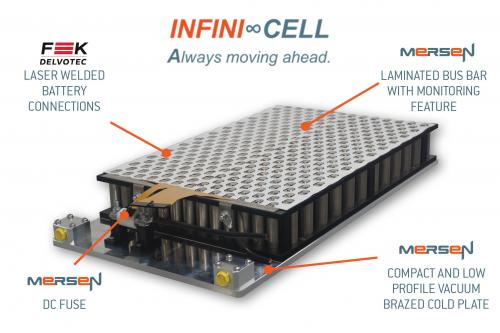 与传统的电池互连解决方案不同,F & K DELVOTEC 激光焊接机接口可确保电池单元与层压母线的高速、安全、稳健和高效连接。这种方法比传统的线/带插入和焊接快四倍多。叠层母线是具有交错触点的超薄单层。母线也是一种“智能”母线,这意味着它不仅可以为电池供电,还可以根据需要监控电池的温度和电压。汇流条还消除了接线错误,并在电动汽车安装中提供了额外的抗冲击和振动强度。为了保护电池组件免受过电流的影响,安装了一个特殊的低瓦特损耗/高循环直流额定保险丝。然后将电池组件固定在超紧凑(仅 7 毫米厚)的液冷冷板上,为所有电池单元提供均匀冷却。